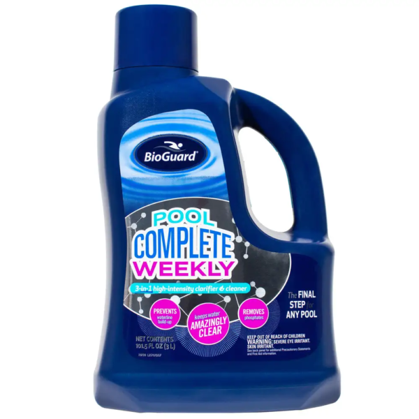 BioGuard Pool Complete Weekly is a 3-in-1 formula that clarifies water, prevents waterline buildup, and removes phosphates for a cleaner, healthier pool.